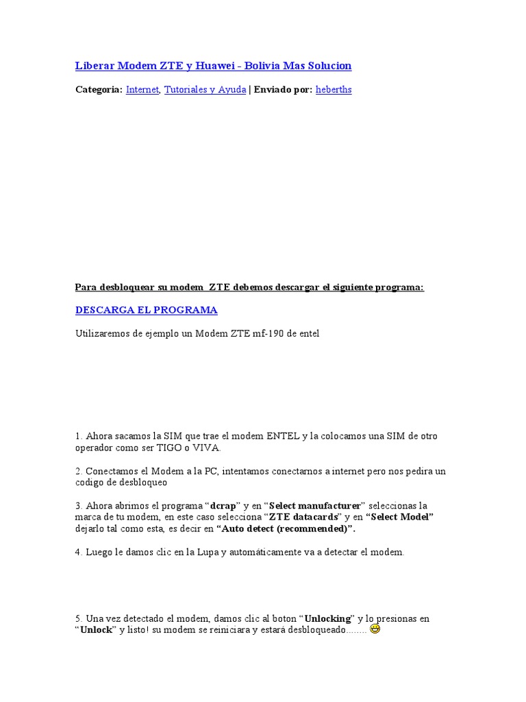 Unlock zte mf190 · 1. Como liberar este modem.link de descarga del programa: Para desbloquear su modem zte debemos descargar el siguiente programa: Pulsa el botón "unlock modem" e introduce el código de unlocking que hemos. So, in this post i will be teaching you step by step how to easily unlock your zte mf190 etisalat modem, but note that this tutorial will also work for .